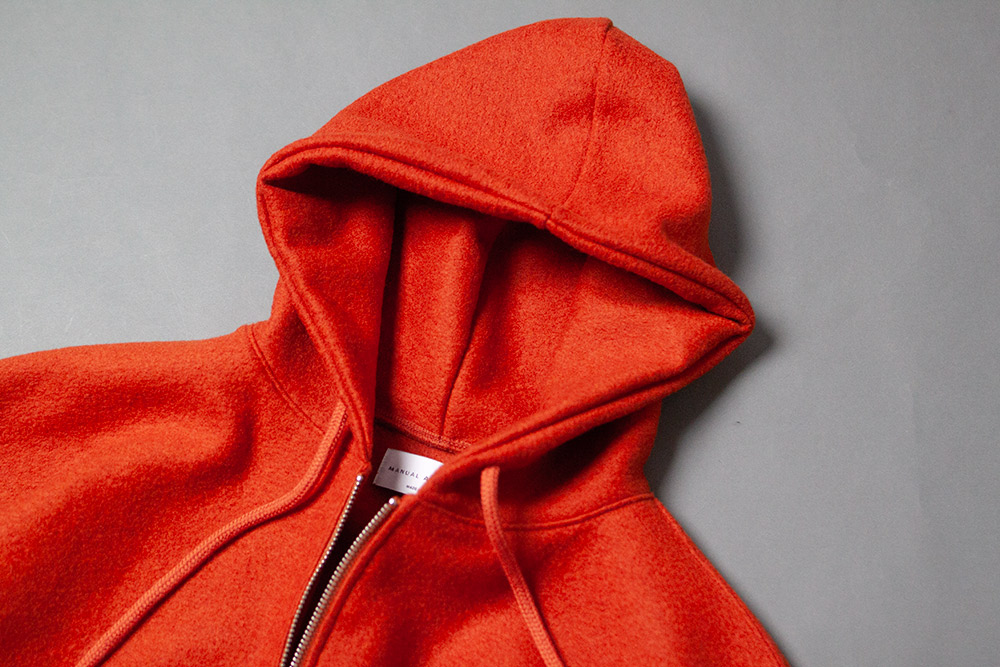 裾をリブで切り替えず、フード付きのコートのようなデザインで仕上げたジップパーカー。